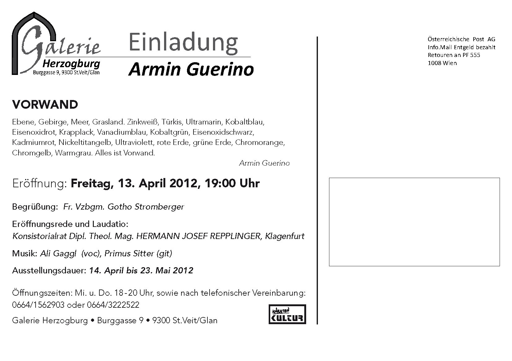 Im gotischen Keller des Alten Rathauses von Völkermarkt, das auch Gericht war, wird vom Donnerstag, den 29. März bis Ostermontag, den 9. April 2007 eine Installation von Armin Guerino zu sehen sein. Sie ist als eine Art-Entgegnung zur entsinnlichten Osterhasenkultur zu sehen und setzt mit ihren eingesetzten Grundmaterialien auf Elementares.