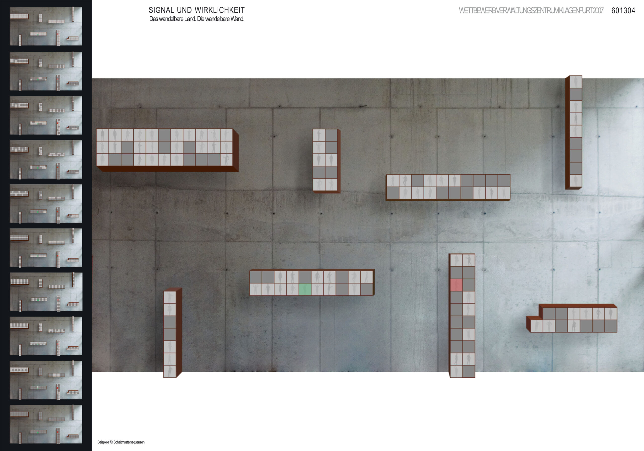Die Aufgaben eines Landesverwaltungszentrums sind vielschichtig und sehr komplex. Die projektierte Arbeit bezieht sich auf die Verwaltungsstrukturen und verknüpft sie mit den Menschen und ihren Lebensorten im Land. Acht modulare Wandkörper stehen für die zehn Bezirke des Landes Kärnten mit ihren 132 Gemeinden, die in Form von Lichtkuben unterschiedlich Lichtsignale aussenden. Jedem Kubus ist der ungleich konturierte Schattenriss eines Menschen zugeordnet.