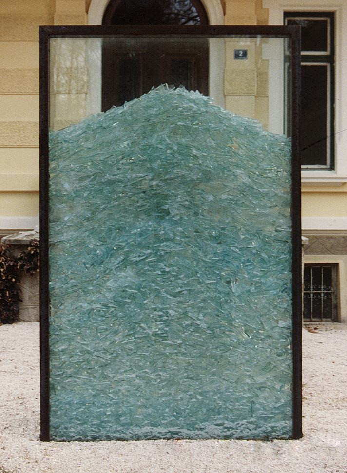 A glass object was commissioned for an area outside an exhibition of Venetian glass art in the castle Reifnitz in Carinthia, Austria. Two glass panels (2.80 x 0.50 x 0.12 m) with steel frames encase transparent broken glass pieces (cullet) of varying sizes and thickness. Light is reflected at the broken edges, creating an image of ice crystals. The object is a dichotomy in forms. The shell is smooth, homogeneous and strong, while the core is coarse and broken, suggesting vulnerability.