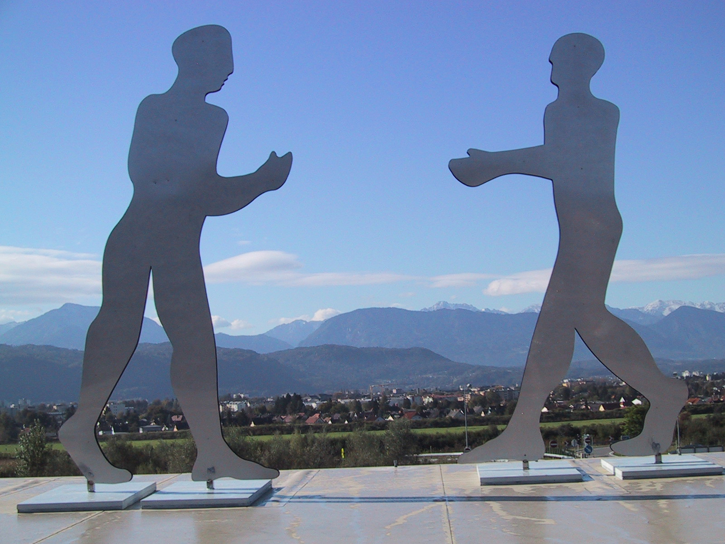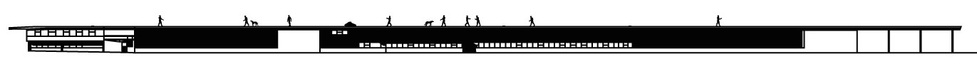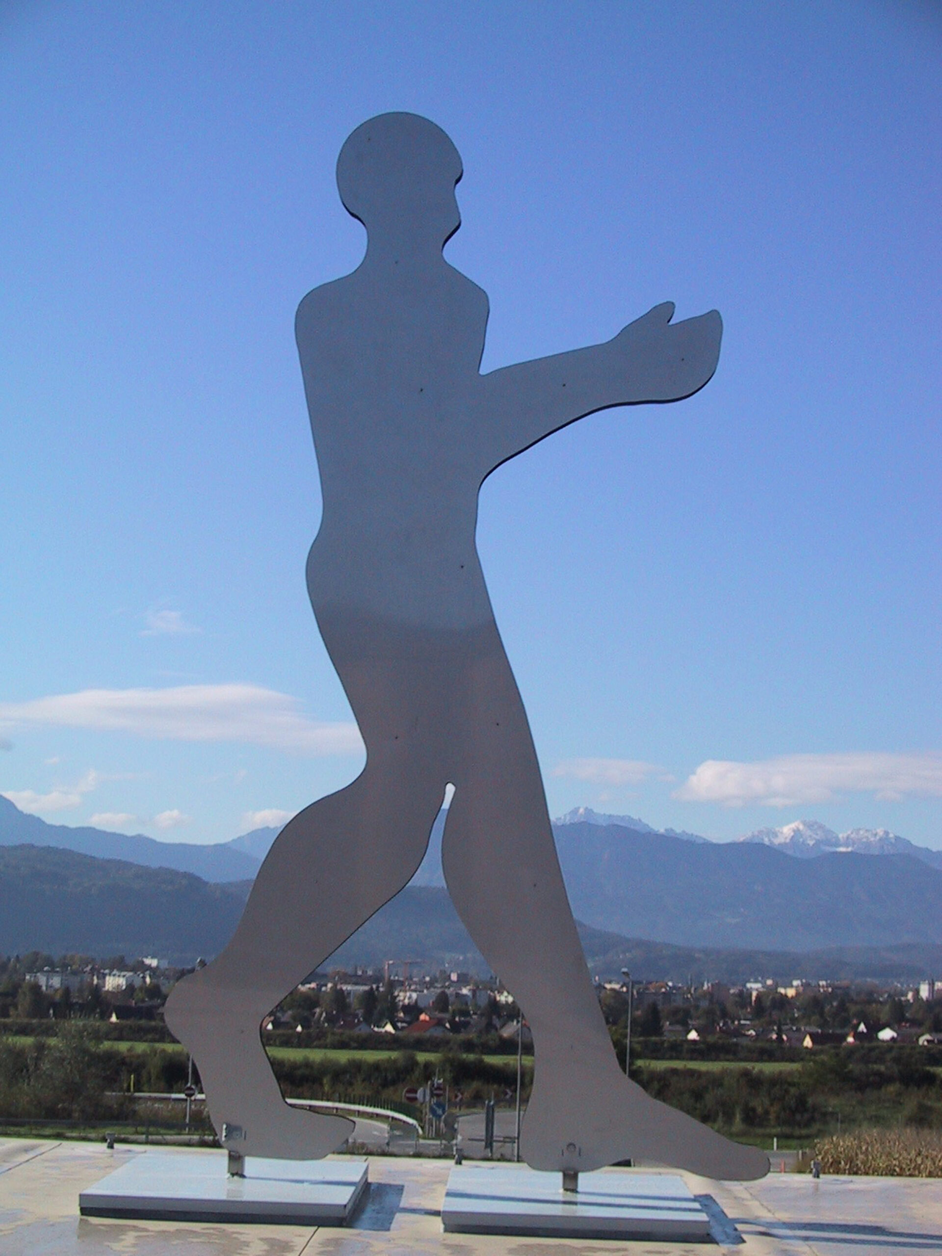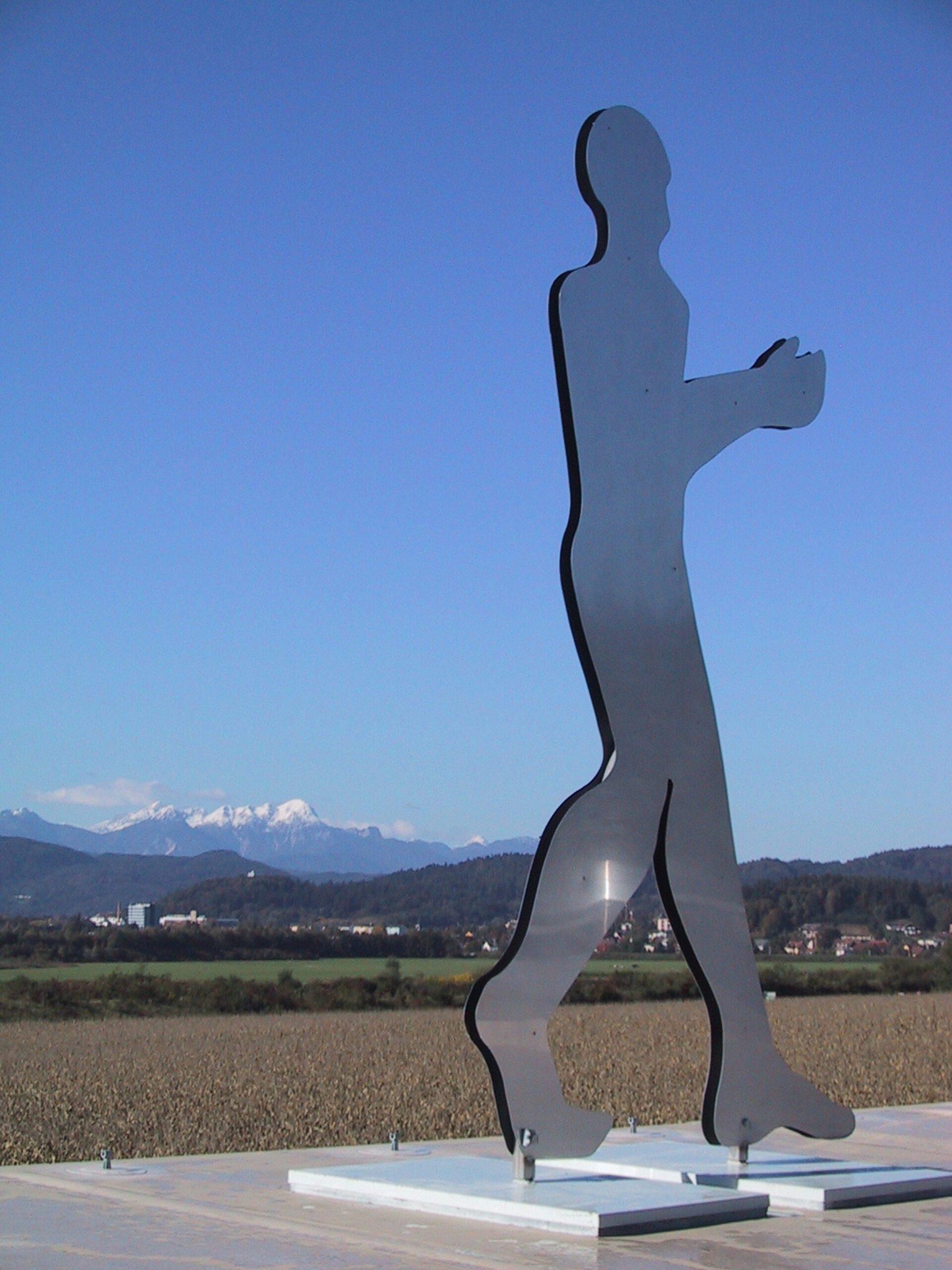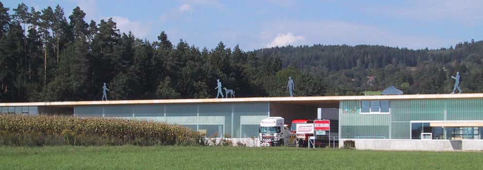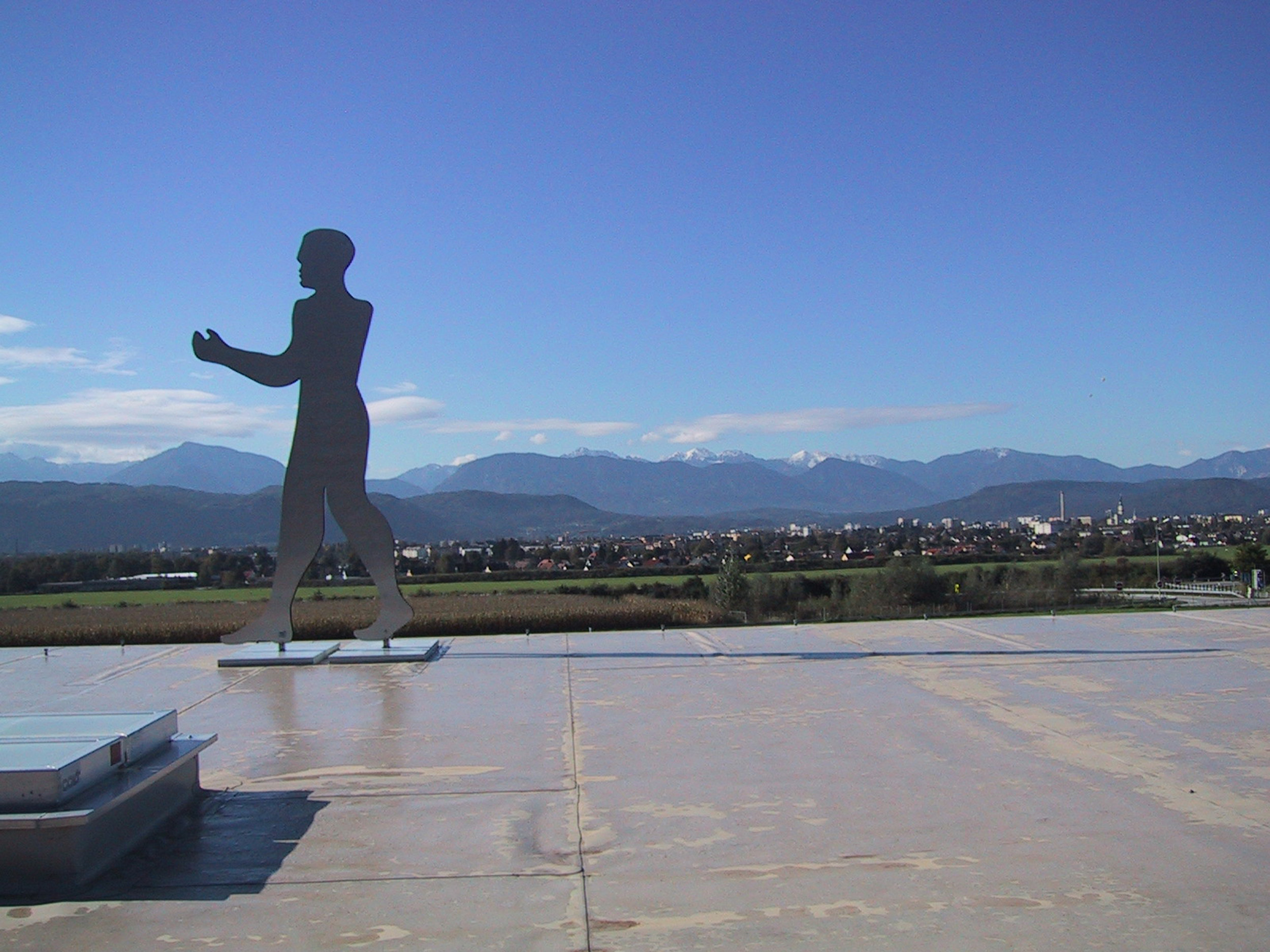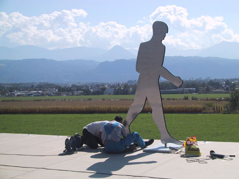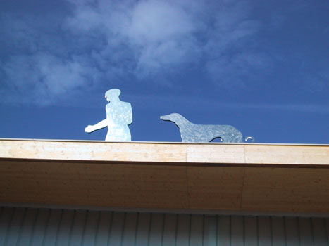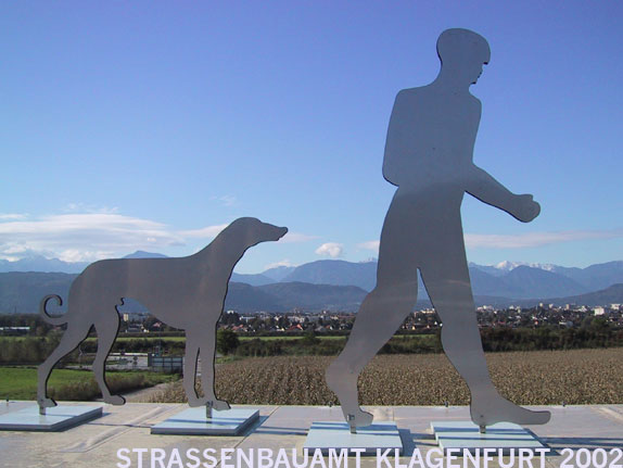 The new building for the Department of Transportation is a long structure and is well integrated into the rolling landscape. The flat roof (12 x 240 m) gives the impression of a free standing piece/ section of road. Its linearity suggests movement, expressed by the greater than life-size figures (approx. 1.5 x 2.8 x 0.04 m) made of stainless steel on the roof. Moving people with a dog and a car represent an everyday scene on the street. It has a surprising effect on the passerby, and at the same time represents the purpose of the building.