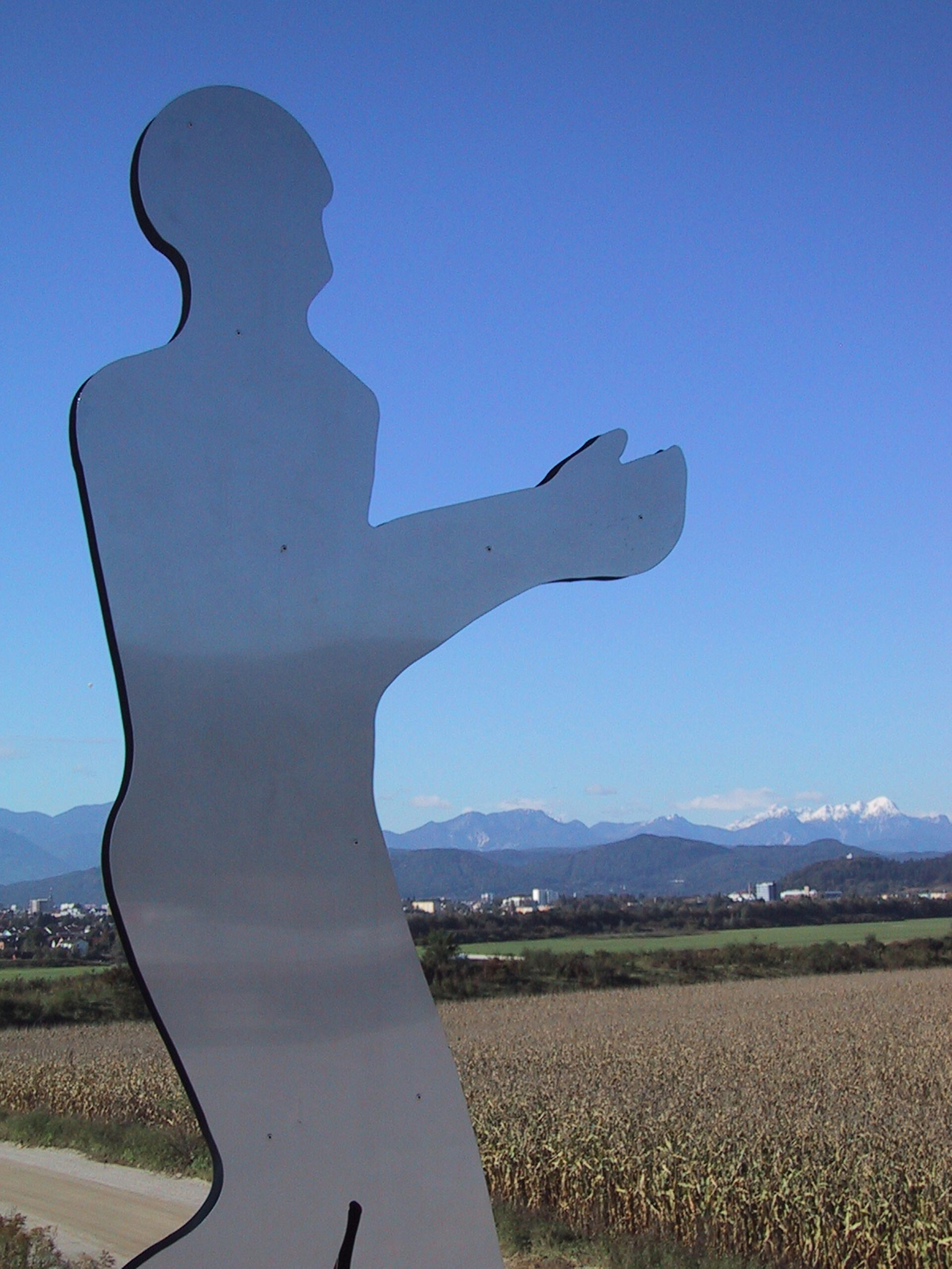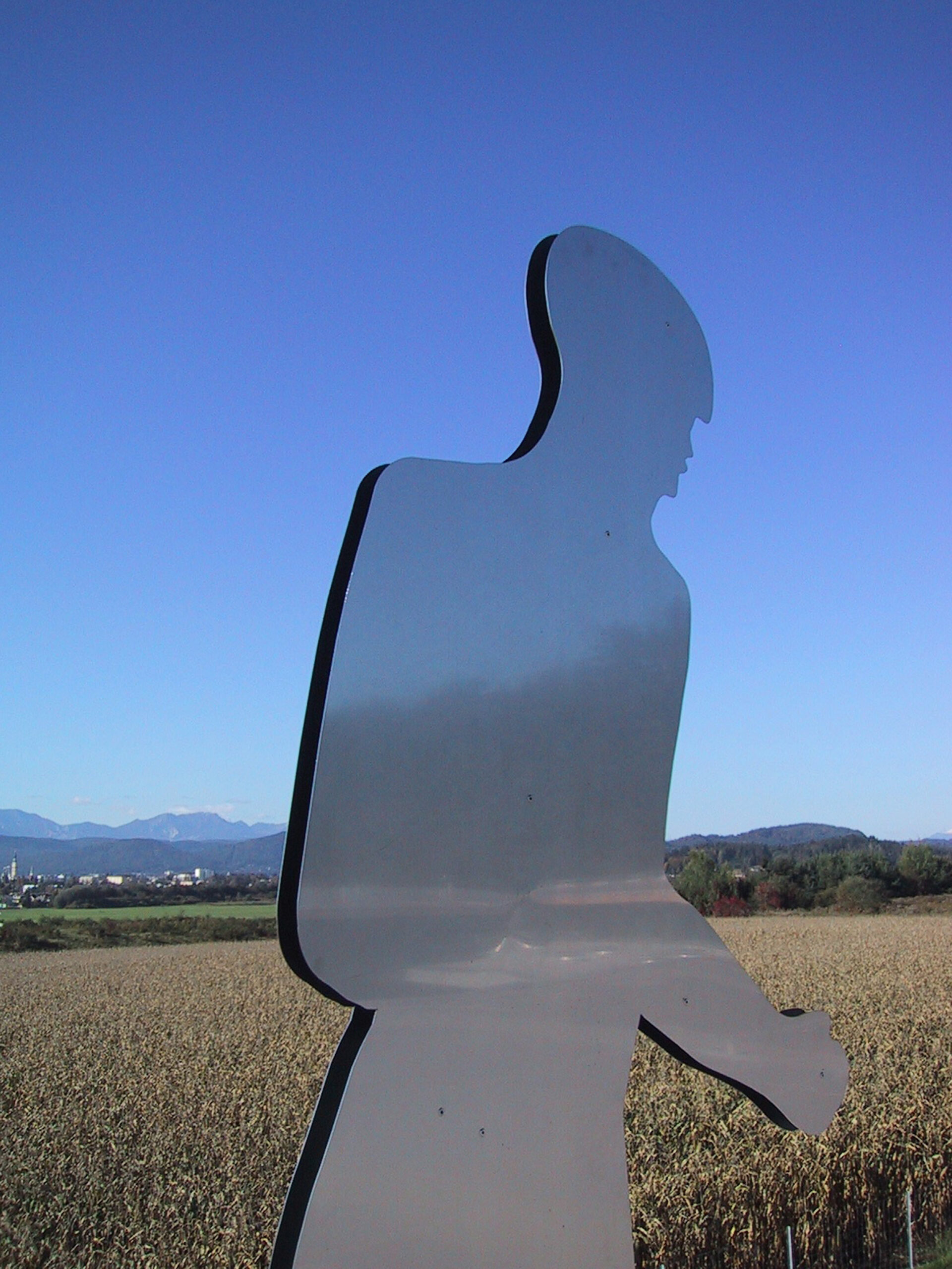 Der Neubau der Betriebsanlage der Straßenverwaltung und des Straßenbauamts ist ein langgestreckter Baukörper, der sich in die fließend verlaufende Landschaft einfügt. Die 12 Meter breite und 240 Meter lange Dachebene des Gebäudes steht wie ein frei stehendes Hochstraßenstück im umliegenden Landschaftsraum. In seiner Linearität wird Bewegung suggeriert, die von den überlebensgroßen Chromnickelstahlfiguren auf dem Dach aufgenommen wird. Die durchschnittliche Größe je Figur beträgt ca. 150 x 280 x 4,3 cm. Menschen in Bewegung mit Hund sowie ein Auto stellen eine alltägliche Straßenszene nach, die einerseits auf passierende BetrachterInnen überraschend wirken, andererseits das, dem Verkehr gewidmete Gebäude rezipieren.