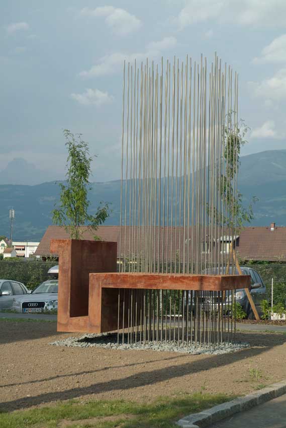 Eine alte kulturhistorische Form, der Mäander, wird von feinen Chrom-Nickel-Stahl-Stäben, „aufgefangen“ und in Schwebe gehalten. Die Dimensionierung des Projektes beträgt 4,00 x 2,85 x 1,80 m. Der Mäander verkörpert in seiner Materialität aus oxidiertem Stahl per se Schwere und Dauer, wobei der Form in seiner Ornamenthaftigkeit das Prinzip der kontinuierlichen Reproduktion beigestellt werden kann. Der immerwährende Kreislauf von erneuernder Energie wird durch die feinen, Regen und somit Leben suggerierenden Stäbe geschlossen.