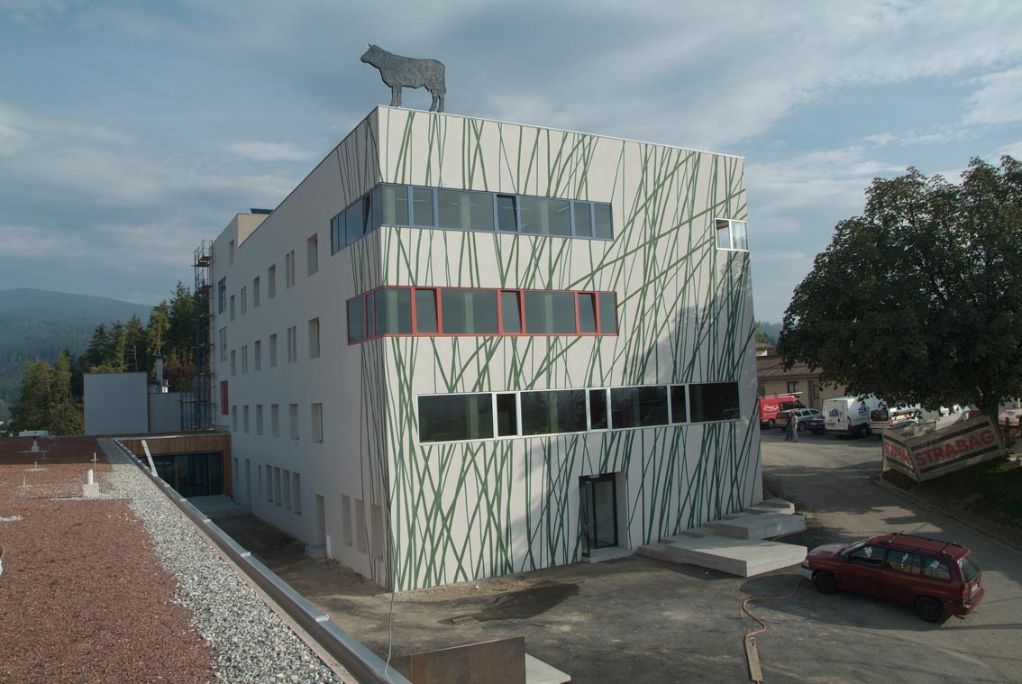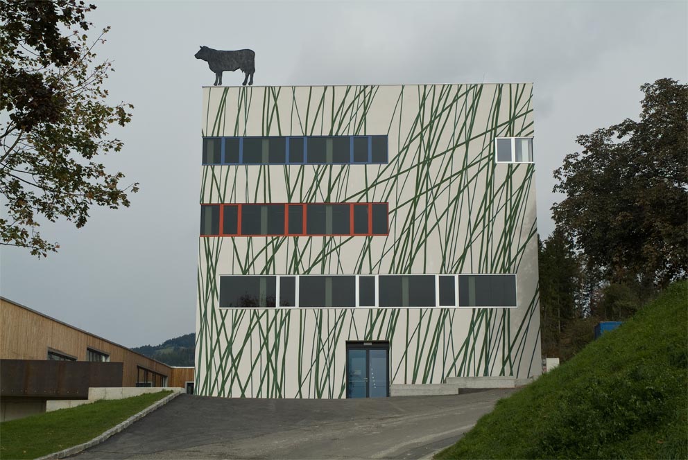 Die landwirtschaftliche Fachschule Althofen fordert ein künstlerisches Konzept, das eine Brücke zwischen Bestands- und Neubau schlägt und gleichzeitig auf das Thema der Schule verweist. Der Entwurf schafft verbindende Elemente zwischen dem auf einer Hanglage höher gelegenen, erweiterten und neu gestalteten Bestandsbau und dem tiefer gelegenen Neubau aus Holz. Zwei lebensgroße Tiere aus Edelstahl, Stier und Kuh, stehen auf den Gebäudekanten: Der Stier auf dem tiefer gelegenem Dach des Neubaus führt den Blick nach oben zu der an der Südwestecke des Bestandsbaues platzierten Kuh, über der sich der offene Himmel frei erstreckt. Dimension und Positionierung der beiden Tiere im Raum erzeugen einen Spannungsbogen, der die Gebäude miteinander in Korrespondenz treten lässt. Im Kontrast zum neuen Gebäude aus Holz mit seinem begrünten Flachdach ist der erweiterte Bestandsbau gemauert. An seiner südseitigen Stirnwand wird man von überdimensionierten, Gebäude hoch gemalten Grashalmen empfangen. Diese greifen seitlich über die Gebäudekanten, um sich in eine dritte Dimension zu erweitern. Die Topografie erinnert an eine Gebirgslandschaft mit Rindern auf sattgrünen Weiden: Mitunter er scheinen die Tiere auf Hang- und Felskanten und wirken in ihrem Verweilen statisch und in ihrer Körperhaftigkeit mächtig, während sie über Abgründe hinweg in die Weite schauen. In der Gestaltung nehme ich das tradierte Bild auf, das üblicherweise für die alpine Landwirtschaft steht und setze es mit den Gebäuden des ländlichen Bildungszentrums in Verbindung. Gleichzeitig wird damit auf die prämierten züchterischen Leistungen der Schule, die sie zum „Mutterkuhzentrum“ in Kärnten werden ließ, verwiesen. Die einprägsamen Elemente Stier, Kuh und Weide schaffen ein weithin sichtbares und identifizierbares Zeichen für die landwirtschaftliche Fachschule Althof