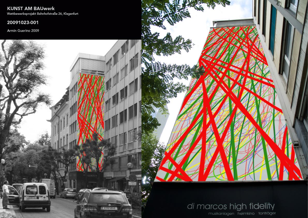 Mit einer mehrfarbigen “Zeichnung” wird die gesamte freie Fläche am Nordfassadenstück überzogen. Sie verleiht dem Gebäude eine aus dem Duktus der Hand stammende Dynamik. Die strenge Quarderstruktur des Gebäudes wird durch den Rhythmus der Zeichnung durchbrochen. Es entsteht eine Spannung die ihre Energie aus den gegensätlichen Strukturen “Handschrift”/”Gebäuderaster” bezieht. Mit ihrer Rotdominanz steht die Zeichnung im Kontrast zum Grün der Bäume und zum grauen Block des Gebäudes und fungiert somit als weithin sichtbare Markierung im Stadtgefüge.