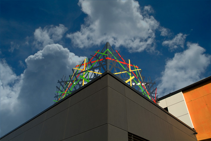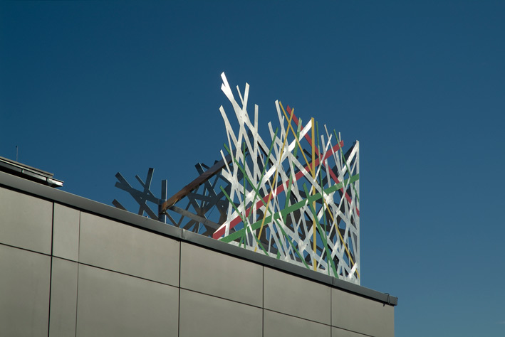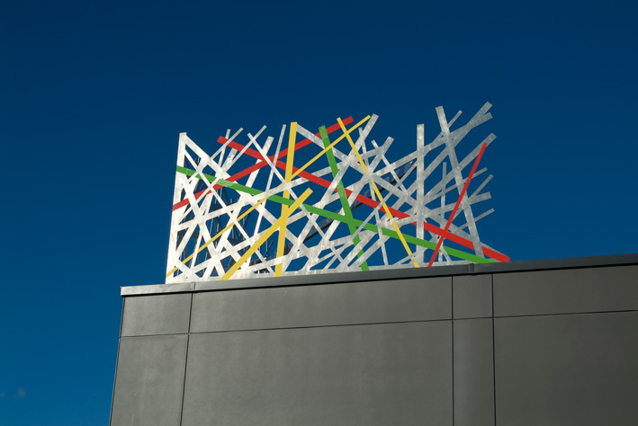 Aus zwei 2,00 m x 4,00 m und 5,00 mm starken Aluminiumtafeln wird die Netzstruktur mit Lasertechnologie ausgeschnitten. Die farbigen Linien werden mit hochfestem, lichtechtem Kunstharzlack gespritzt.
