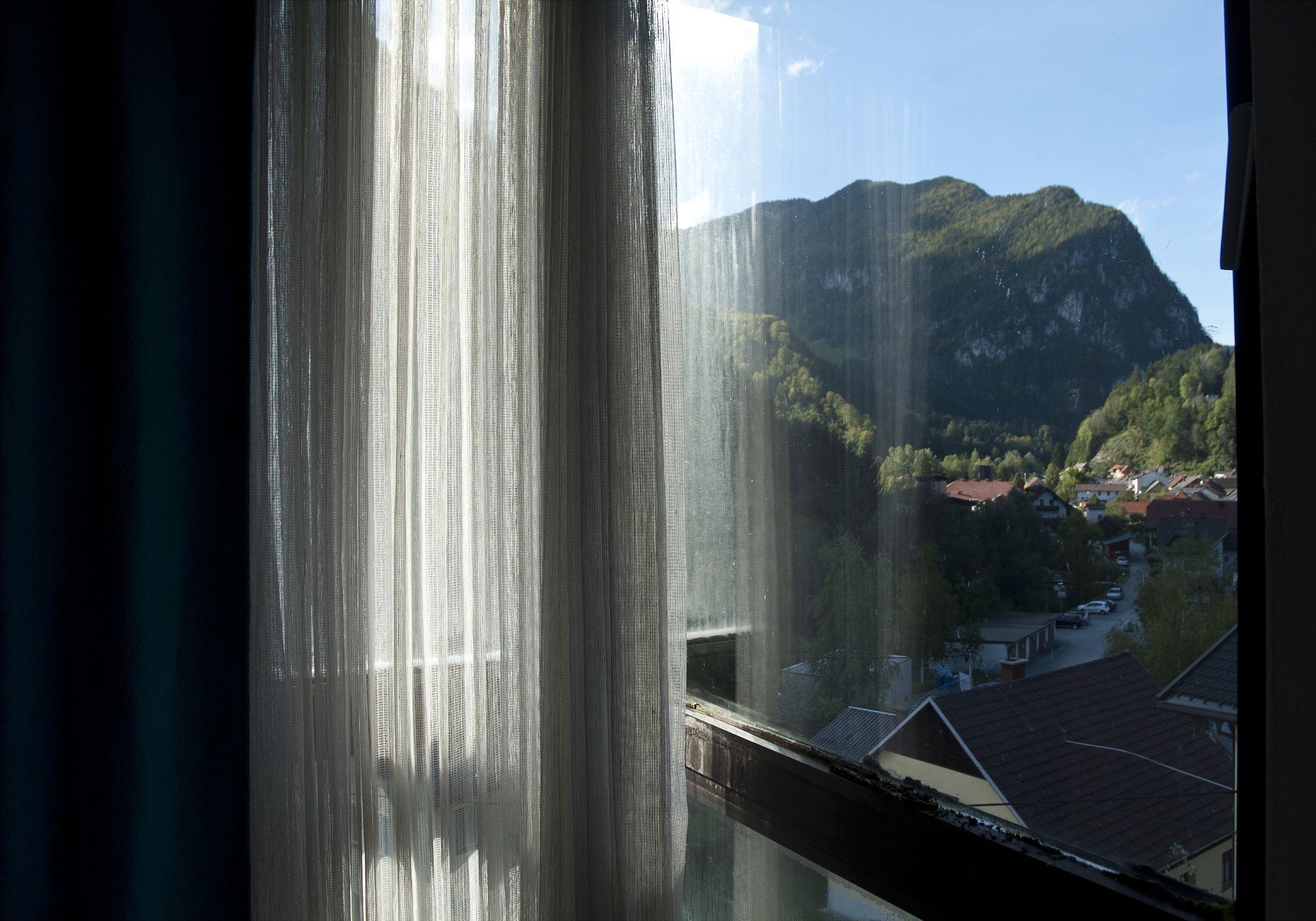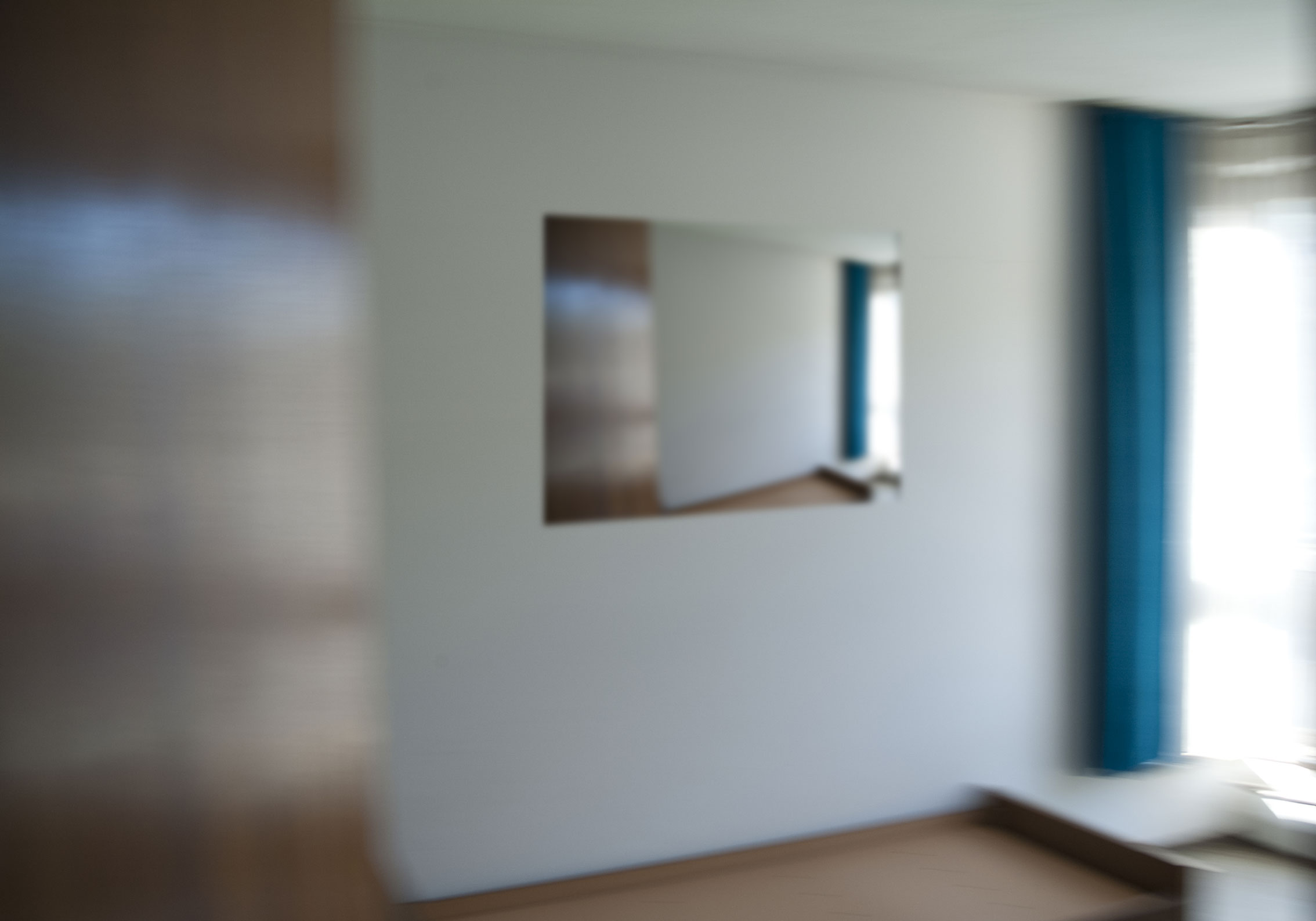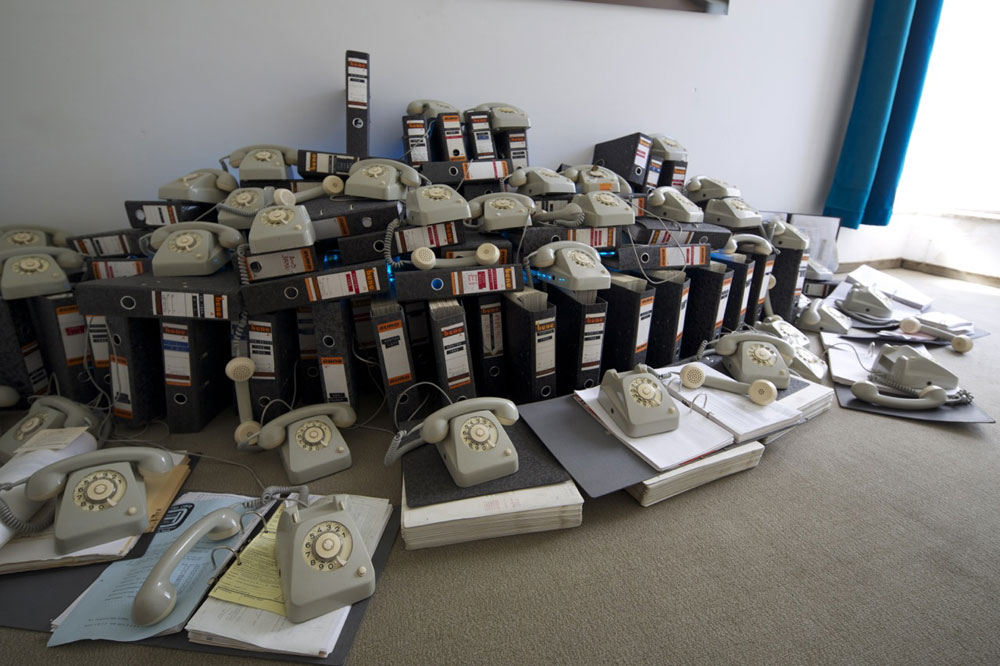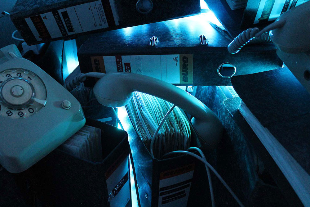 Im letzten Geschoß des Hotels betritt man das Zimmer 411. Im Raum türmt sich ein Berg zurückgelassener Akten der Hotelverwaltung. An dessen Rändern, der horizontal und vertikal gestapelten, teils geöffneten Ordner, dringt ein lichtblauer Schimmer an die Oberfläche. Das an kosmische Energie erinnernde Licht entmaterialisiert den Aktenberg und macht ihn damit unantastbar und abgeschlossen. Dieser Umstand lässt sich gleichermaßen auf die Geschichte des Hotels übertragen. Alle Zimmertelefone des Hotels liegen verstreut auf dem Aktenberg und läuten ohne Unterbrechung, gleichzeitig dringen von der Lobby Geräusche von Menschen und Worte von der Rezeption nach oben. Und es ist gerade die Unerreichbarkeit, die irritiert. So wie die Abbildung des Raumes mit einer Abbildung des Raumes an der Wand über die Installation in ihrer Unschärfe einerseits ein Hinweis auf eine vergangene Raumsituation ist und gleichzeitig eine einprägsame Gegenwärtigkeit ausstrahlt, wiederholt die Abbildung neben dem Fenster den Blick durch das Fenster.