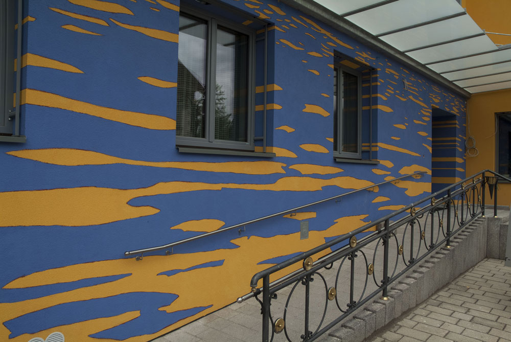 Die ultramarinblaue Wasseroberfläche setzt sich an der Ostfassade fort. In dem mit Glas überdachten Eingangsbereich nehmen auch die Fensterlaibungen die Wellenstruktur des Wassers auf und betonen das Körperhafte dieser Wand.