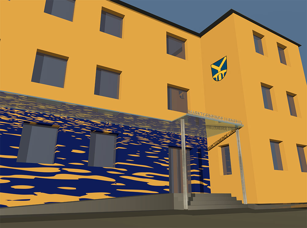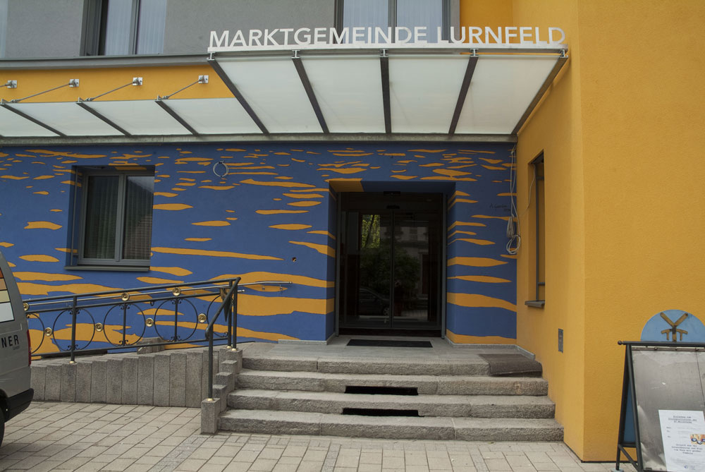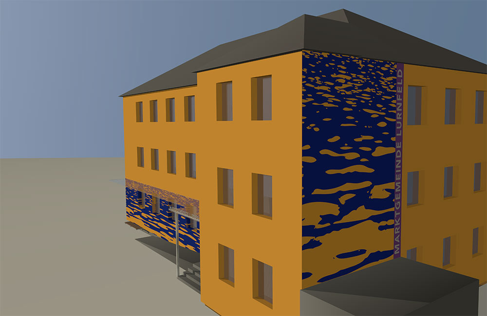 Zwei Wasseroberflächen mit ihren Spiegelungen und Reflektionen stehen für die Flüsse Möll und Drau. An der Nordseite, über die Brücke der Möll blickend, nimmt die Malerei die Bewegungen des Wassers wie ein abstrahierender Spiegel auf und reflektiert den am Gemeindezentrum vorbei fließenden Fluss. Ein vertikaler Schriftzug mit dem Wortlaut „MARKTGEMEINDE LURNFELD“ weist auf die Funktion des Hauses hin und gliedert die Nordfassade.
