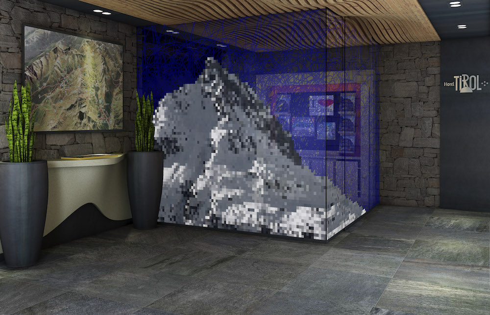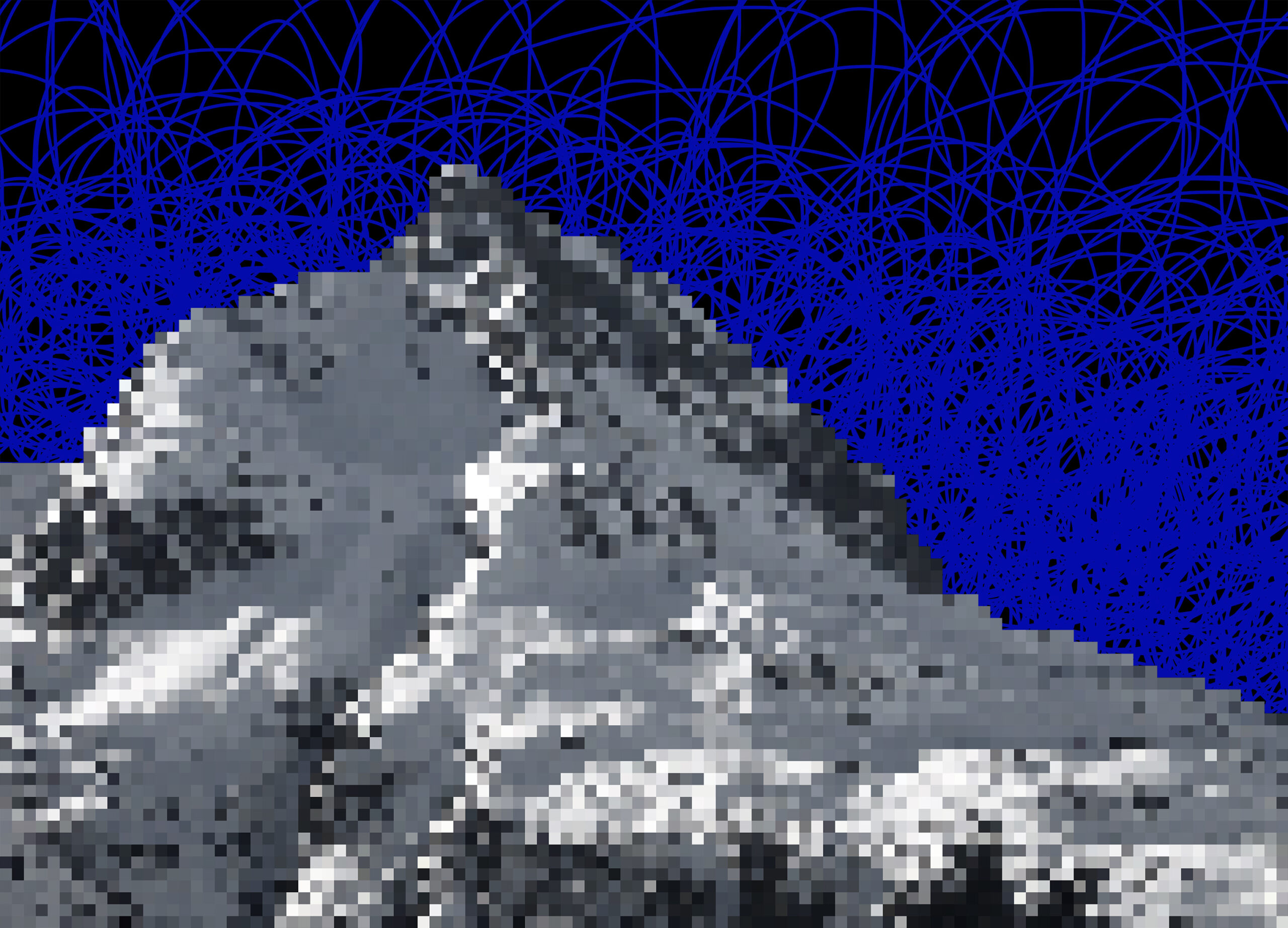 Ein aus blauen Strichen gekritzelter Himmel mit seinen transparenten Zwischenräumen erzeugt eine frei schwebende Dynamik und kontrastiert die in Pixel aufgelöste Abbildung der Ballunspitze. Je stärker man sich dem Objekt nähert um so abstrakter wird die abgebildete Bergformation.