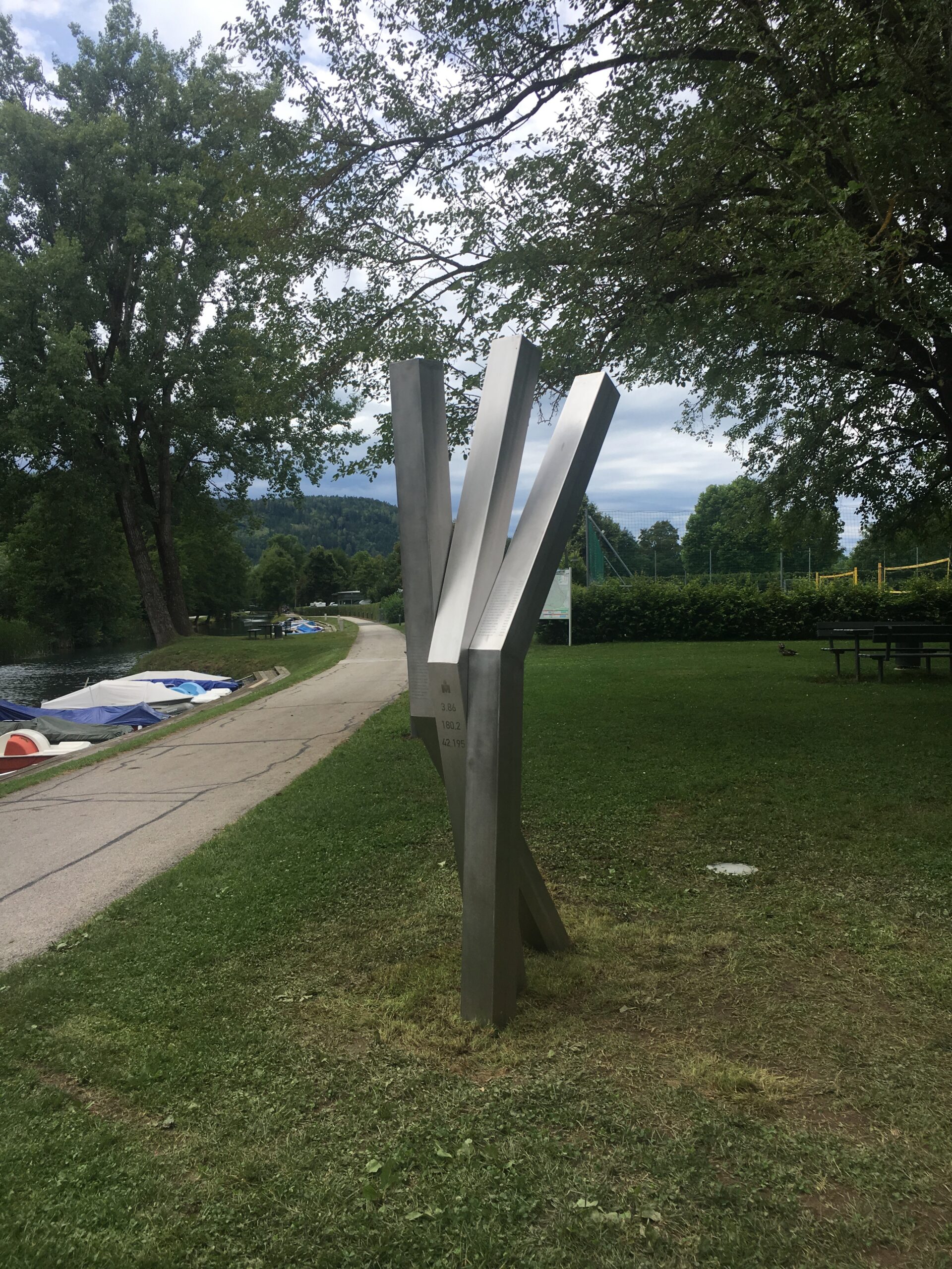 In ihrer Dreiteiligkeit stehen die beiden identen Ironman-Stelen für die Vereinigung der Sportarten Schwimmen, Fahrradfahren und Laufen. Gerade die Ausschnitthaftigkeit der Formgebung, der Anriss der Laufbewegung und die Wahl des Materials beschreibt die gesamte Kraft und Dynamik, die für die Ausübung dieser extremen und herausfordernden Sportart notwendig ist. Ausgeführt werden die Stelen in rostfreiem Edelstahl und sind knapp 2,60 m hoch, 0,45 m tief und ca. 0,98 m lang. Am mittleren „Bein“ sind unter dem Ironman-Logo die Distanzen der drei Disziplinen, die es zu erreichen gilt, eingeschrieben. Am linken und am rechten „Bein“ werden die Gewinnerinnen und Gewinner der letzten 20 Jahre eingetragen. Diese können bis ganz nach oben hin jedes Jahr ergänzt werden, sodass die Eintragungen an den oberen Vorderseiten für 100 Jahre Platz finden. Die Schriften werden elektrochemisch eingebracht und können somit auch vor Ort jedes Jahr ergänzt werden. Die zu errichtenden Betonfundamente sollen so angelegt werden, dass sie 15 cm unter der Gras- oder Makadamoberfläche zu liegen kommen. Hier wird die Grundplatte der Stele mit dem Fundament verschraubt. Danach wird die Oberfläche mit Erde für den Grasbewuchs bzw. mit Makadam verfüllt.